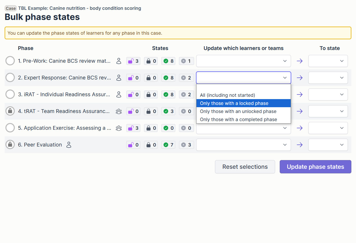 This section provides educators with the ability to change the phase state for selected groups of learners or teams. There are two dropdown options: