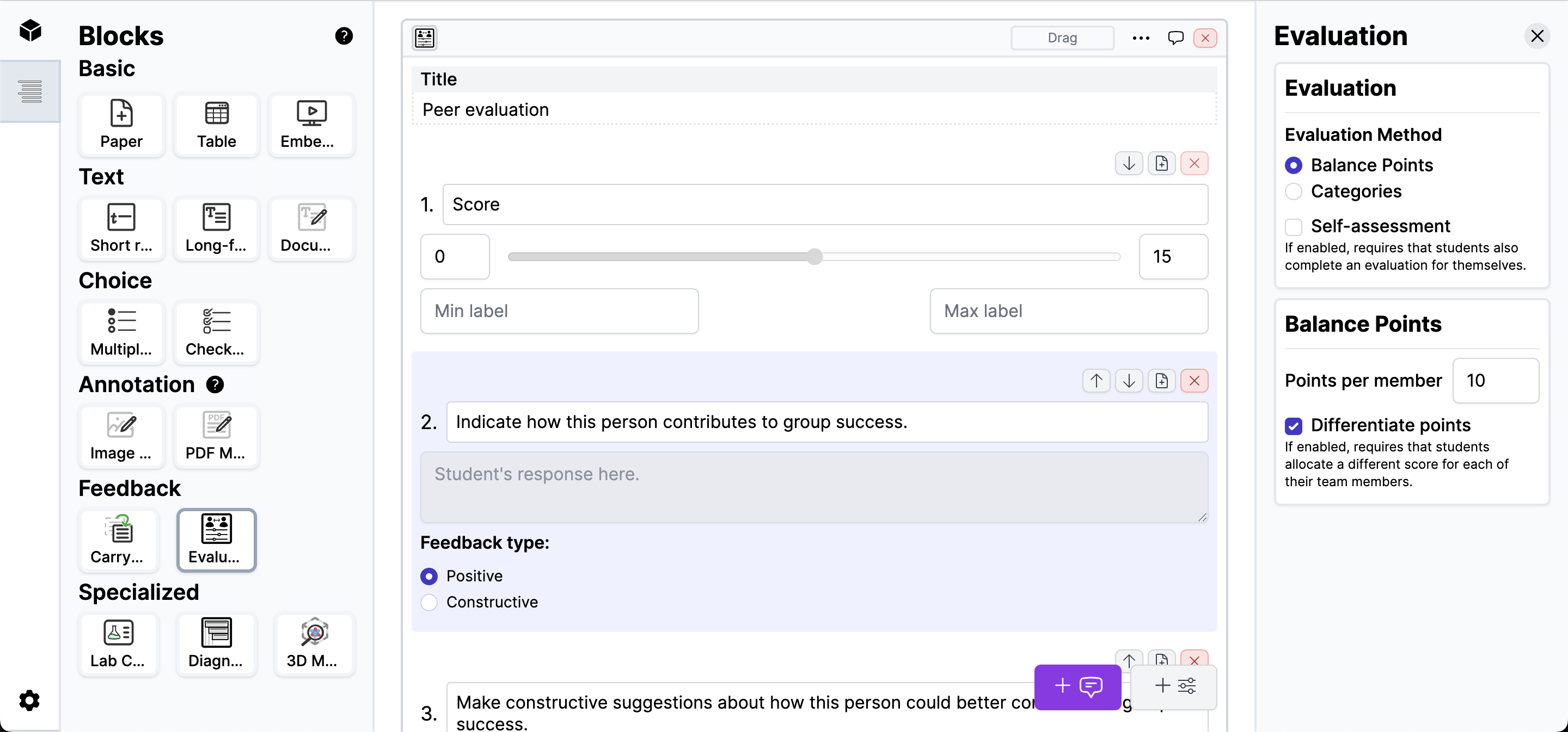 An evaluation block is a phase authoring component that allows the creator to add an evaluation where students assess their teammates in both quantitative and qualitative ways to give anonymous feedback.