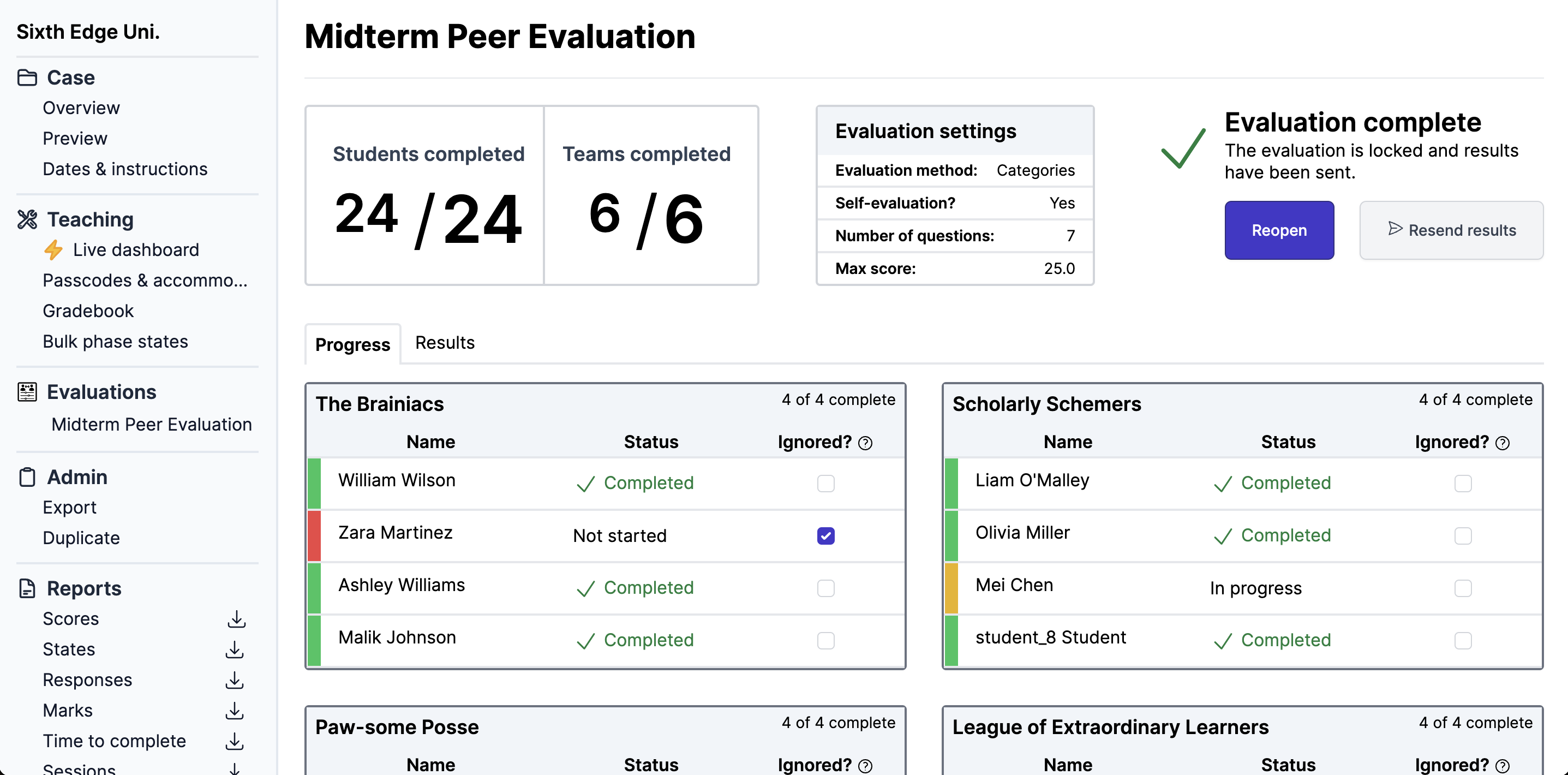 If you don’t want a learner’s responses to be included in the results or score calculation for their team members, you can mark them as Ignored using the checkbox next to their name in the “Progress” tab of the evaluation view. By default, empty responses are omitted from results and score calculations.