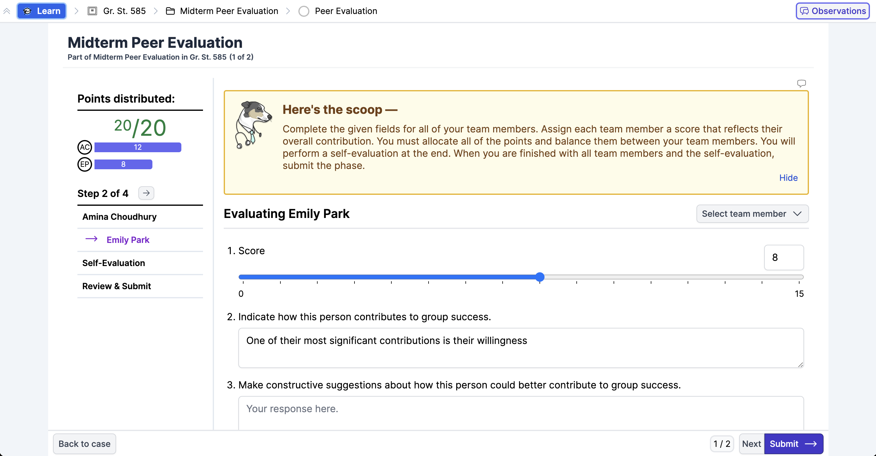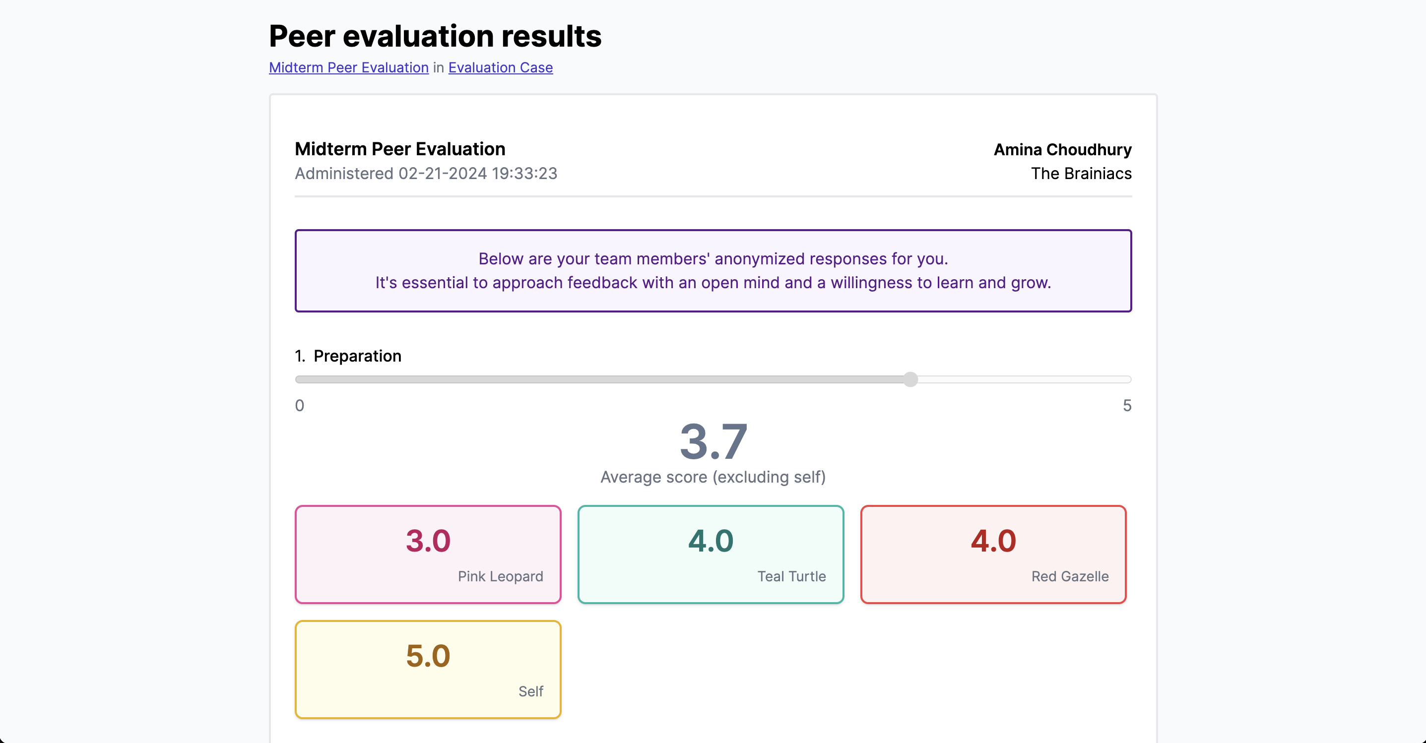 You must complete all quantitative and qualitative fields of the evaluation for every team member before you are able to submit the phase. Once you complete the evaluation, wait for results to be emailed to you when the teacher sends the results. The email contains a link to a results page which contains the anonymized feedback from your team members.