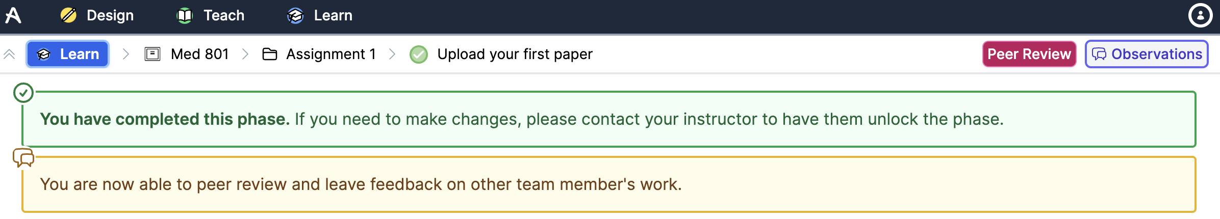 After learners complete a phase with peer review enabled, they are able to go back to that phase and view the work of other learners on their team who have completed the phase.