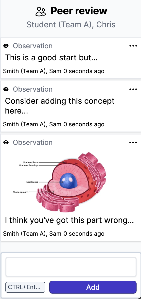 When learners view a completed phase with peer review enabled, they can use the Peer Review button and select another learner or team’s work to enter commenting mode. Every block in Allele has a button in the top right that allows reviewers to leave feedback on the learner’s work contextualized to that block.