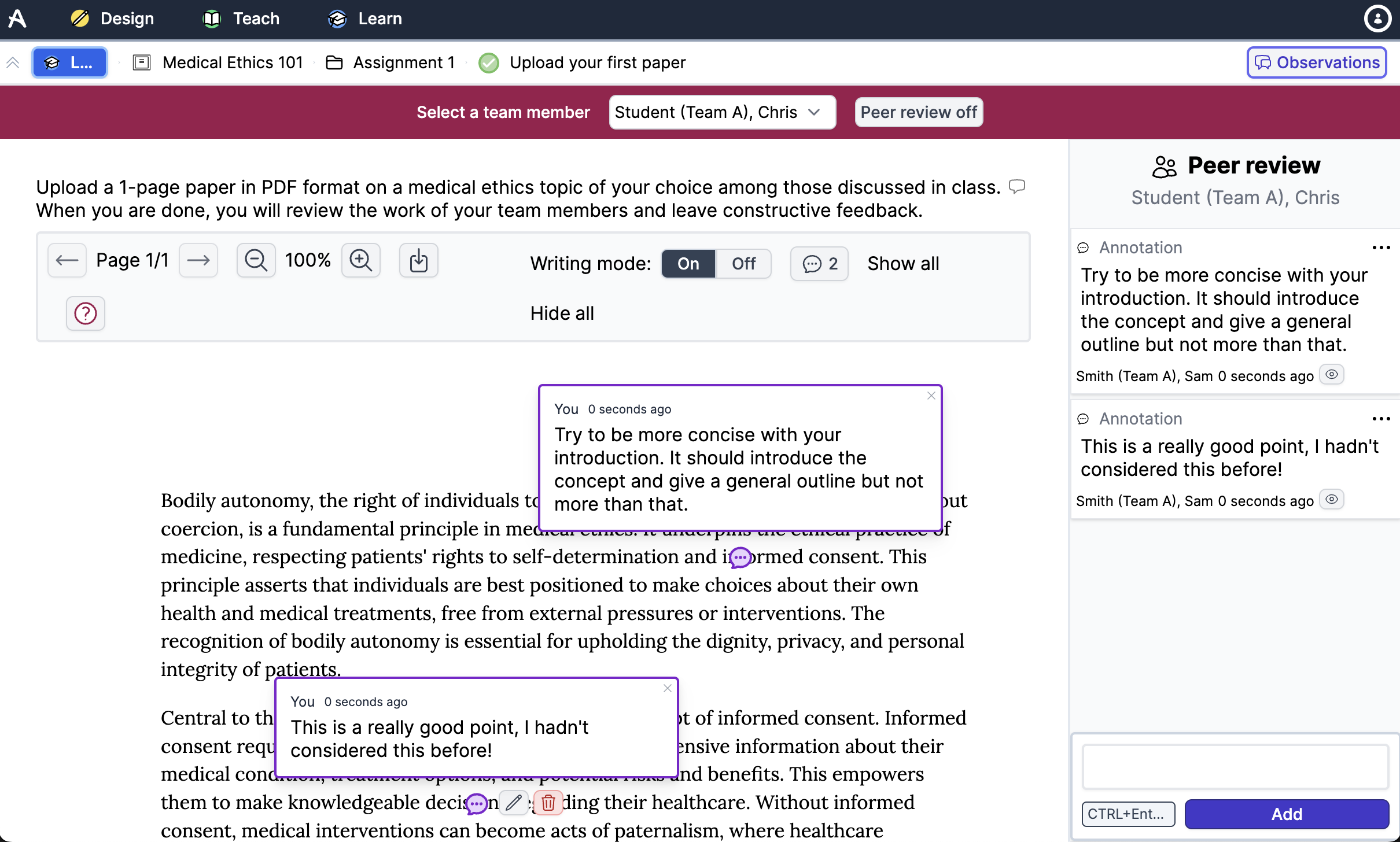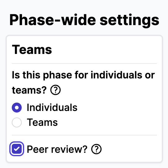 In Allele, peer review is a feature that allows learners to assess and comment on the work of their team members, or, in the case of team phases, other teams. Peer review can be enabled as a phase-wide setting.