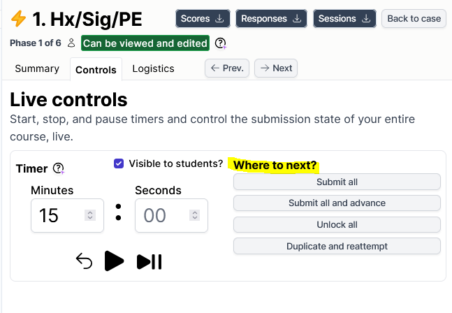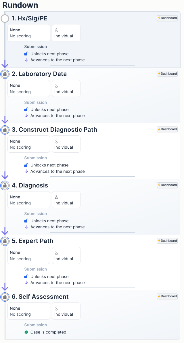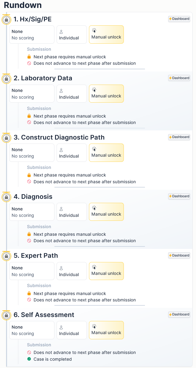 For cases that are intended to by taken in a synchronous environment, like an in-person classroom, it’s common to want to have more granular control over where your students are at in the content and what they can access. A typical phase sequence for scenarios like this may look like: