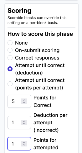For any block that can be automatically scored, there are a variety of scoring options that will determine the student’s experience when interacting with your question: