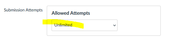 - In the Assignment’s “Submission Attempts” configuration option, set it to allow for unlimited attempts