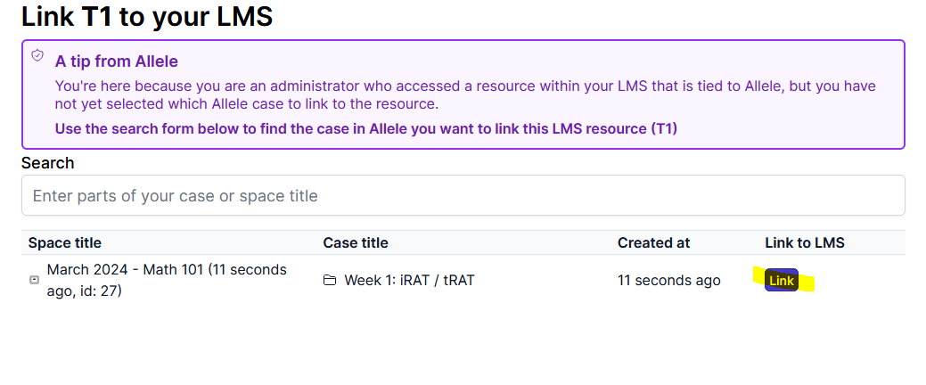Allele’s link page where you select the case you want to link to the Canvas Assignment: