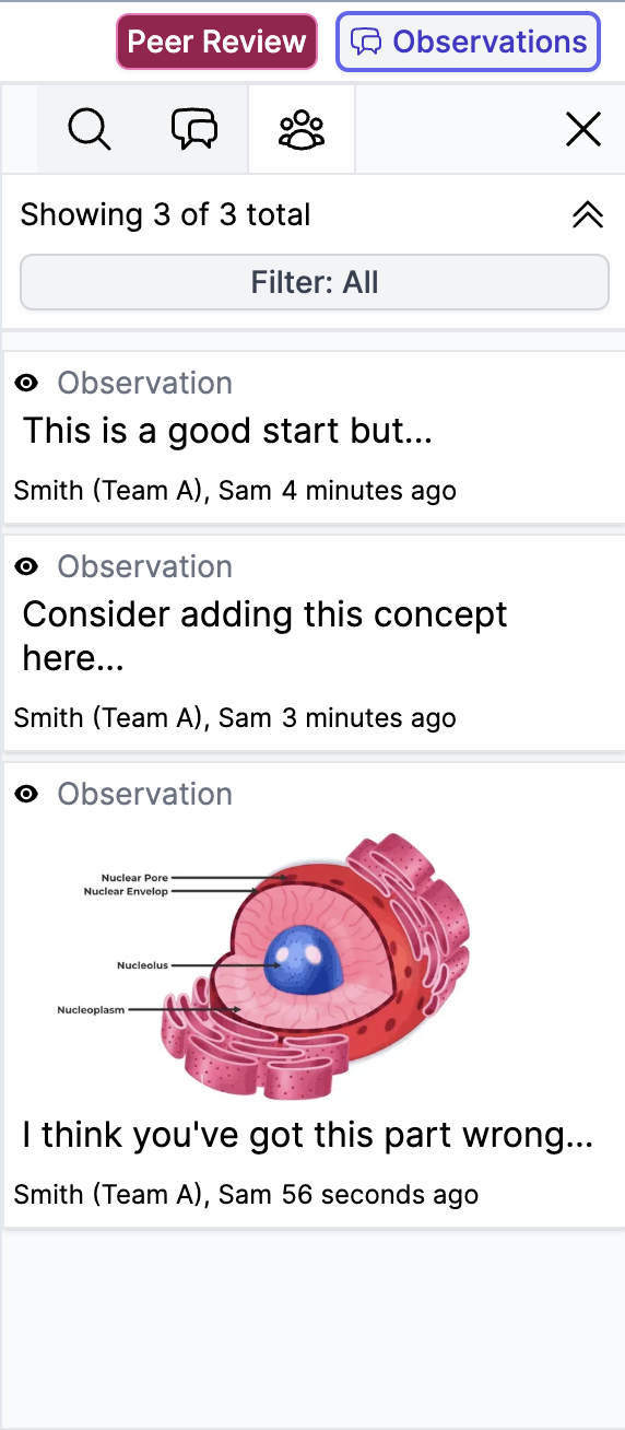 To view comments made on your work by your team members, exit peer review (if peer reviewing) or navigate to your completed phase and open the Observations list next to the Peer Review button. Click on the Feedback pane in the Observations list and you will see all the comments from team members on your work.