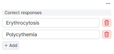 - Allows students to enter an abnormality name. Authors can customize the inputs required (“Erythrocytosis”, “Anemia”, etc.), including multiple correct responses if there are acceptable synonyms. Additionally, authors can configure how many incorrect attempts students can input before displaying the correct answer.