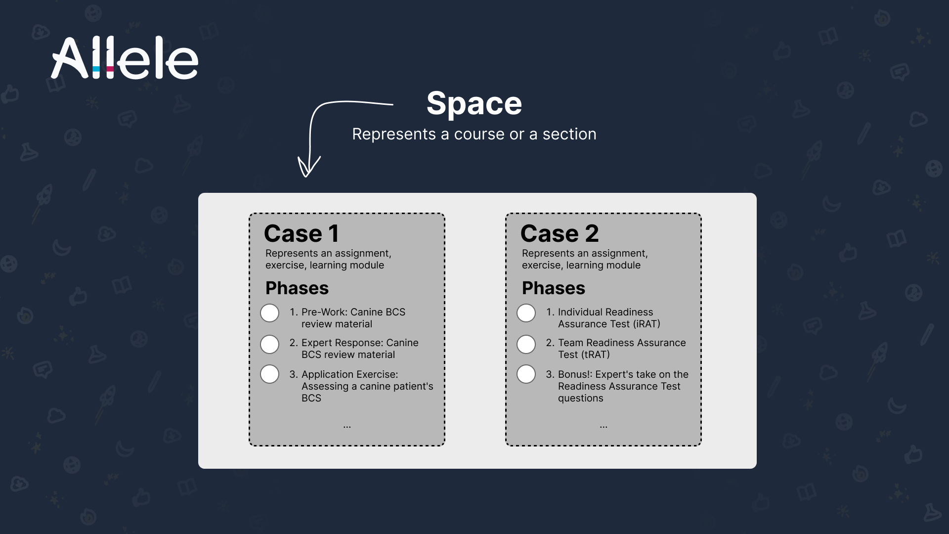 In Allele, a space is usually synonymous with a course or a section of a course, but it can also be used to group trainings, workshop content, continuing education, and more. Each space in Allele will have a unique roster, so each time you bring on a new cohort of students, you will find yourself creating new spaces.